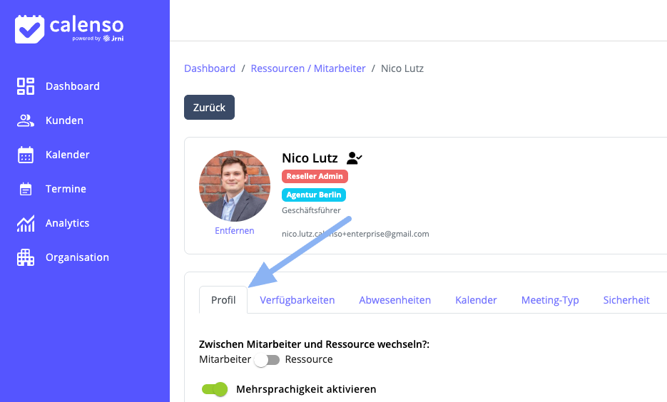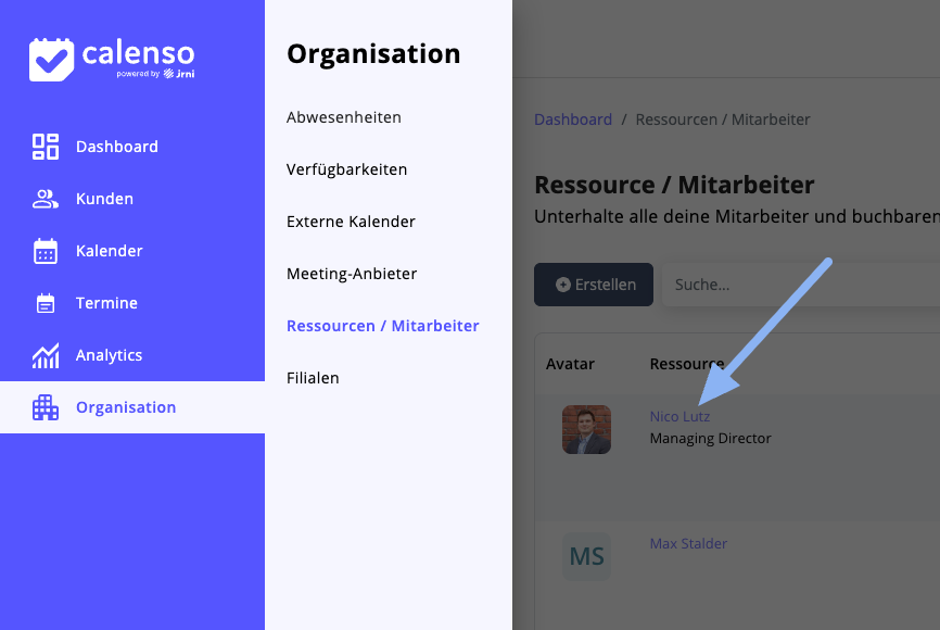 Gehen Sie dazu über Organisation > Ressourcen / Mitarbeiter und klicken auf den Namen des gewünschten Mitarbeiters.